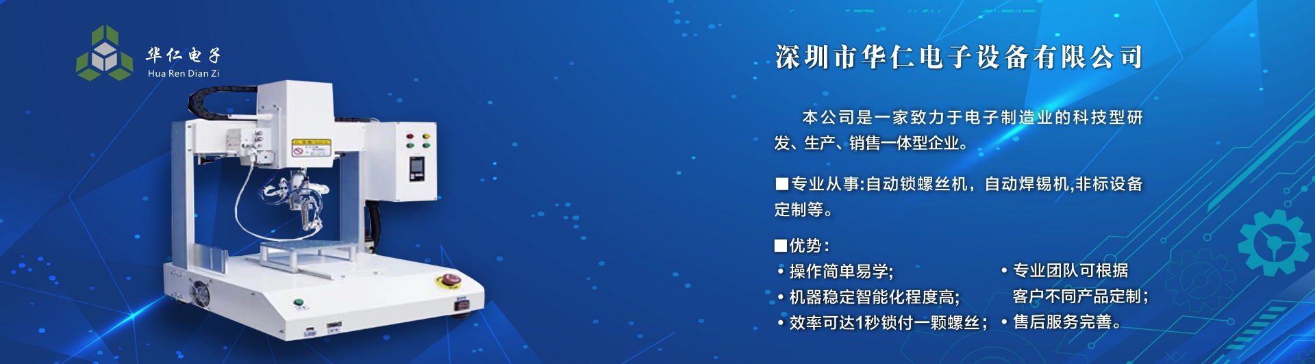 深圳市華仁電子設(shè)備有限公司是一家致力于電子制造業(yè)周邊設(shè)備的科技型研發(fā)、生產(chǎn)、銷(xiāo)售一體的企業(yè),專(zhuān)業(yè)從事:自動(dòng)鎖螺絲機(jī);自動(dòng)焊錫機(jī);非標(biāo)設(shè)備定制機(jī)等,公司長(zhǎng)期以來(lái)在行業(yè)中積累了豐富的經(jīng)驗(yàn),擁有專(zhuān)業(yè)的研發(fā)、技術(shù)、銷(xiāo)售支持工程團(tuán)隊(duì)、各高級(jí)技術(shù)人才為客戶(hù)提供優(yōu)質(zhì)產(chǎn)品和服務(wù),同時(shí)不斷吸取國(guó)內(nèi)外先進(jìn)技術(shù),更準(zhǔn)確及時(shí)地為客戶(hù)提供優(yōu)質(zhì),性?xún)r(jià)比高的產(chǎn)品、公司以專(zhuān)業(yè)的售前、售中、售后服務(wù)贏得了客戶(hù)的信賴(lài)和好評(píng),為客戶(hù)提供先進(jìn)自動(dòng)化設(shè)備一體式解決方案、